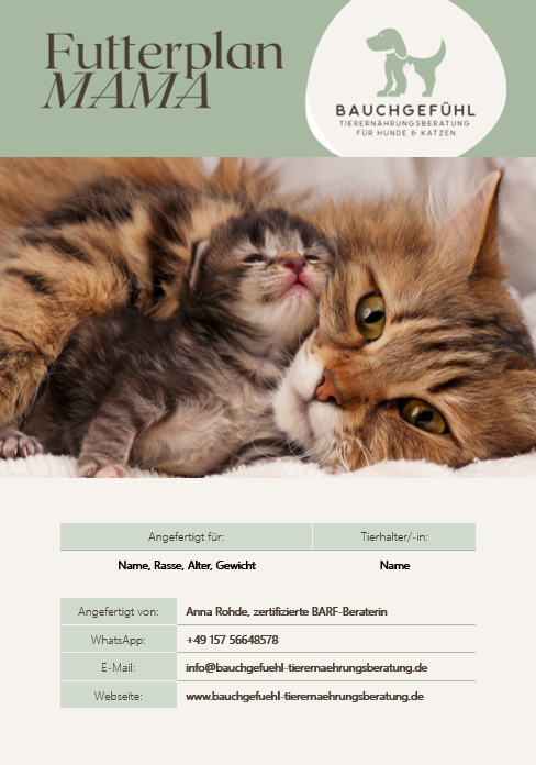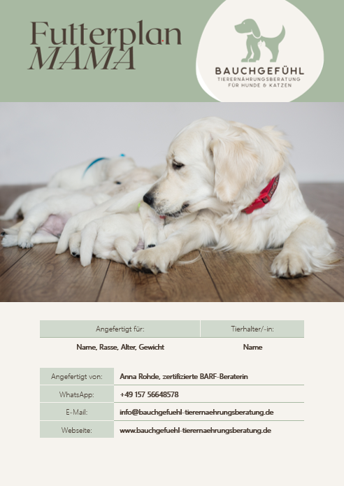 Mit dem Futterplan MAMA erhältst du einen individuell erstellten Ernährungsplan, der auf die besonderen Bedürfnisse deiner Hündin oder Katze während der Trächtigkeit und Milchproduktion abgestimmt ist – basierend auf deinem Online-Anamnesebogen und ggf. vorhandenen Befunden.